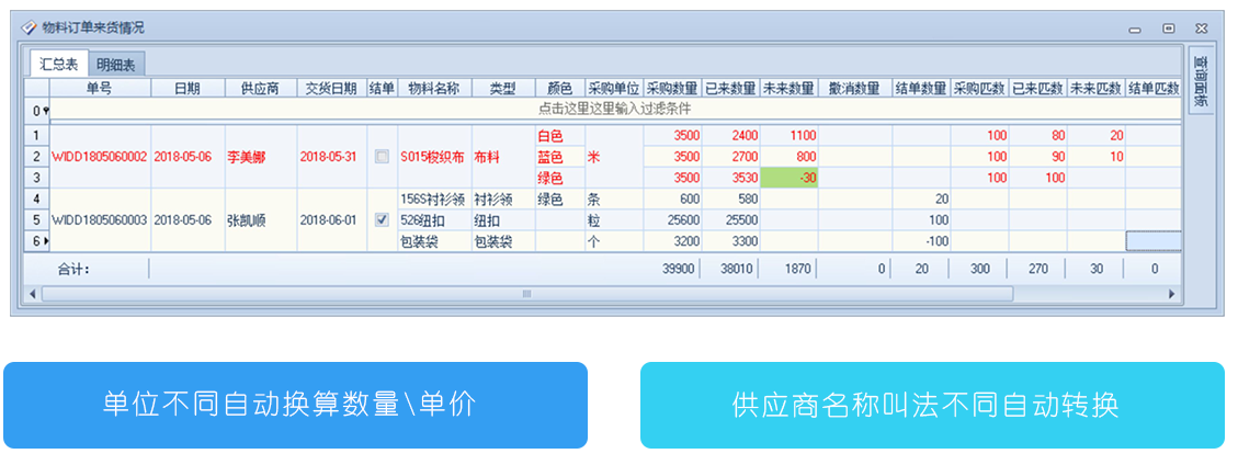 轻松跟进每张采购订单:订了什么物料、来了多少、还差多少没回来、货期提前预警等。