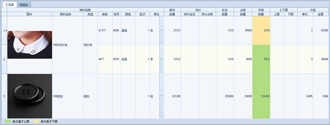 一张表体现各物料的所有情况:库存、预计在途、预计占用、在途、占用、可用、上限、下限。
