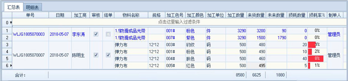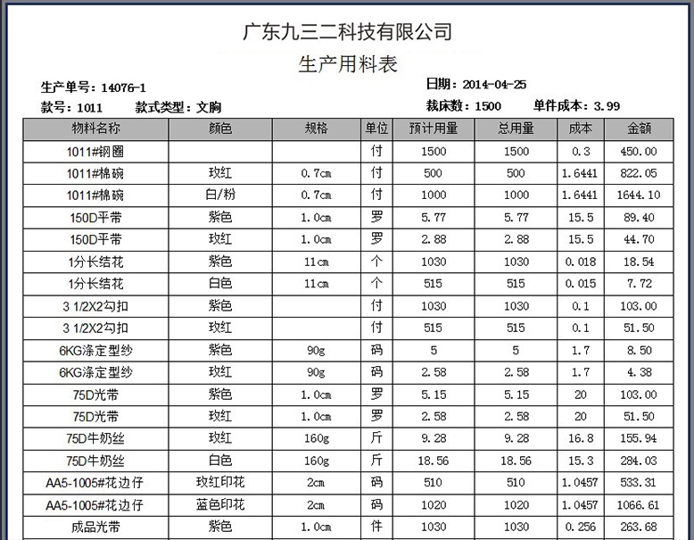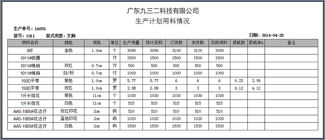 清晰每张生产计划单、每个款的生产用料、采购数、来货数、领用数、损耗数、损耗率等